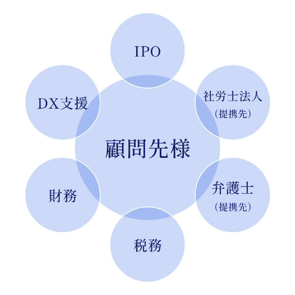 税金に関することだけでなく、融資・補助金獲得支援による財務面のサポート、DXコンサルティングによる業務効率化のサポートなどを通じ、お客様の成長を共に実現いたします。